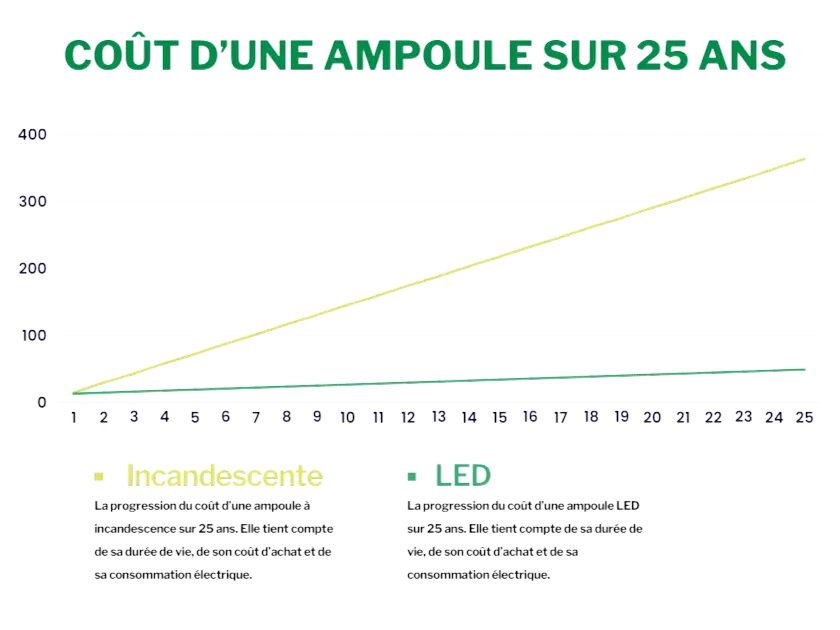 À la 25ᵉ année, le coût des ampoules à incandescence et leur utilisation aura coûté 364 € et utilisé 2 268 kWh. En revanche, le coût de la LED et son utilisation aura coûté 49,5 € et utilisé 308 kWh.