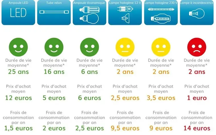 - Ampoule LED : prix d’achat = 0,48 €/an ; frais de consommation = 1,50 €/an ; soit un total de 1,98 €/an