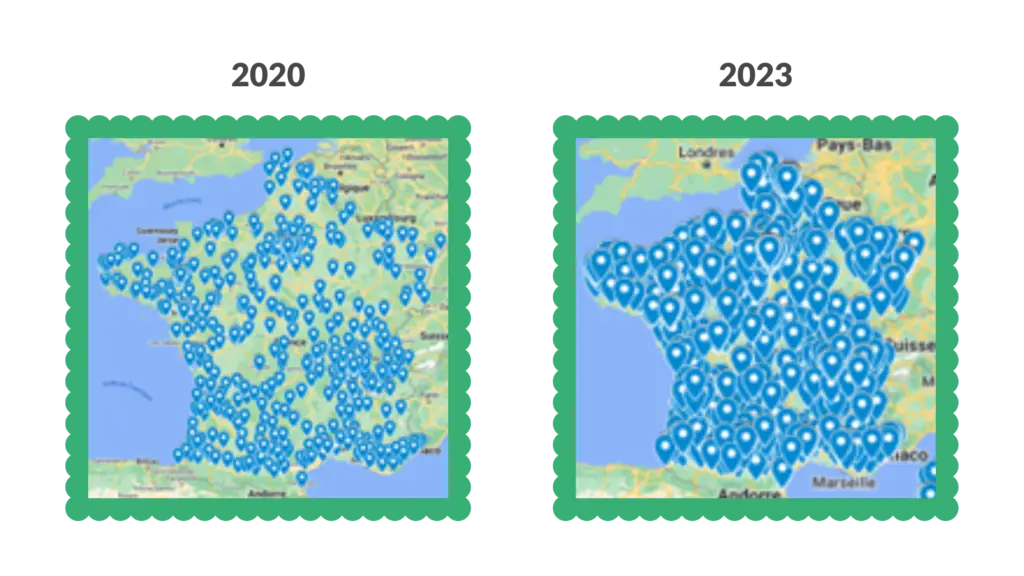 La présence de tiers-lieux sur le territoire français a pratiquement doublé entre 2018 et 2023. France Tiers-Lieux dénombre pas moins de 3 500 tiers-lieux en 2023, contre 1 800 en 2018 !