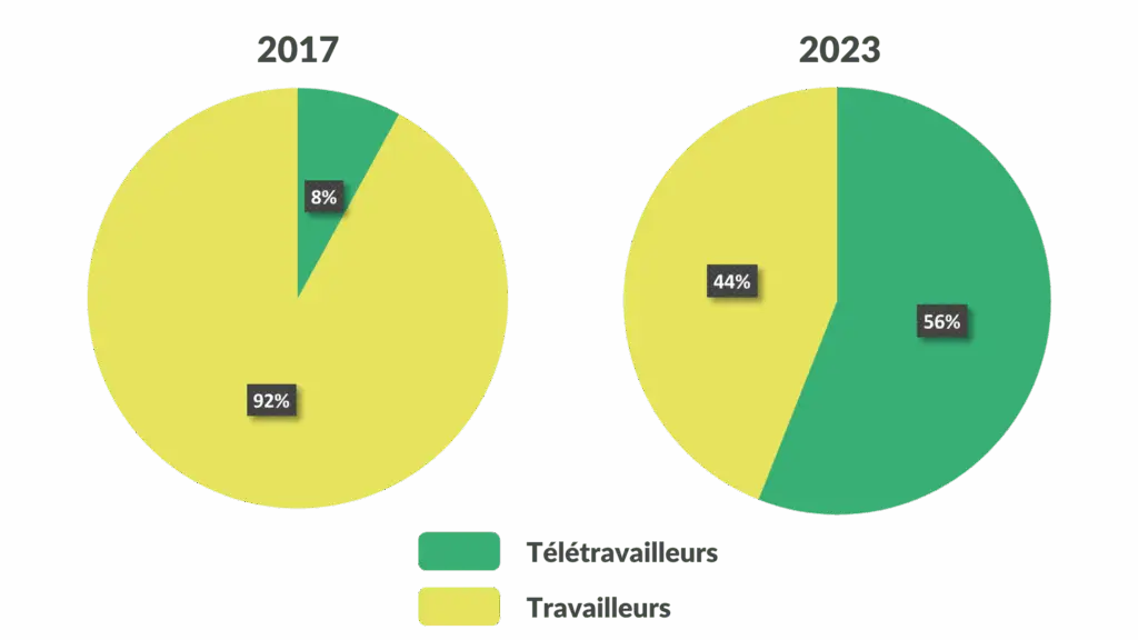 En France, en 2017, la part du télétravail était de 8% tandis qu’en 2023, celle-ci était de 56%.
